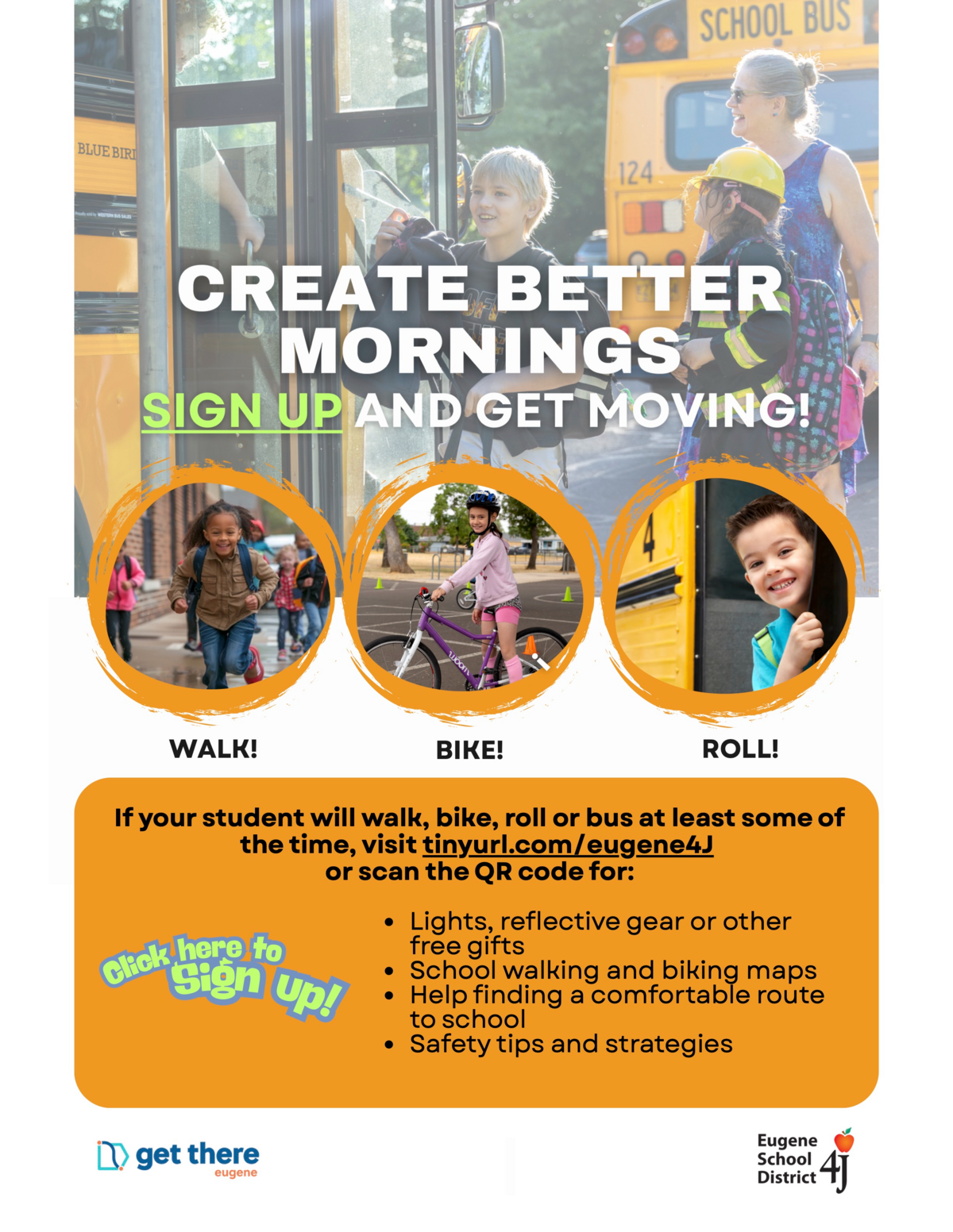 As you gear up for the school year, it’s time to think about how your child(ren) will get to school. September weather and the start of the school year are a great time to set new goals for the family. Making small changes to your daily routine can lead to a surprising number of benefits for your family and community! We encourage students to walk, bike, skate, scoot, bus or carpool to school for their health and readiness to learn, the safety and congestion in our parking lot, and the environment. If you’ve got to drive but still want the health and academic benefits for your child and want to avoid the challenge of the parking lot, try parking a few minutes from school and walking the rest of the way. It’s a great time to connect with your child and could become a favorite part of your day!If you have concerns about your route or would like help planning a walking/biking route or starting a biking or walking group, contact 4J’s Safe Routes to School Coordinator at mazze_s@4j.lane.edu or 541-790-7539. You can find tip sheets on walking and biking and more on the Safe Routes to School Regional website.