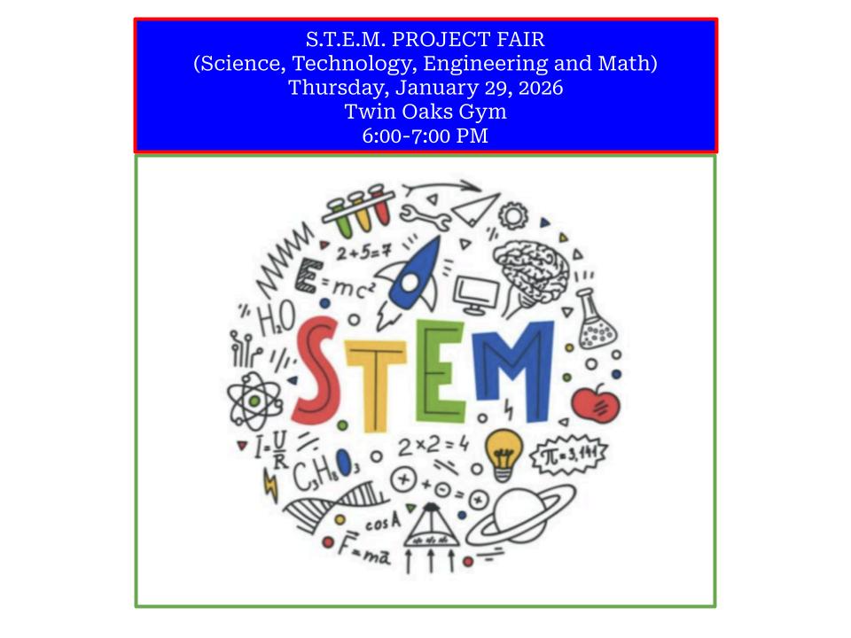 At the end of January, Twin Oaks will host the Science, Technology, Engineering and Math (S.T.E.M.) Project Fair! If your child would like to participate, please fill out this Google Form. All projects must be completed at home, and brought to school the morning of the fair. A detailed information packet is attached to this message, including links to websites for project ideas. Now, during the break from school, would be a great time to start planning your project. When we return to school, we will send home the trifold cardboard project boards, on Friday, January 9th. That will give you 3 weeks to finish your project before the fair. PLEASE OPEN THE ATTACHMENT BELOW FOR ALL THE DETAILS...